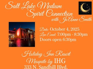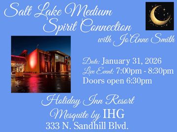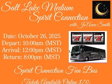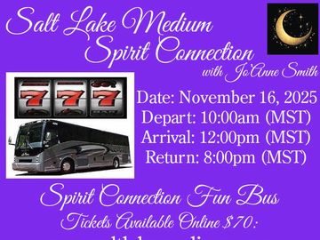 Hop on the Fun Bus with Jo’Anne Smith, the Salt Lake Medium! Enjoy a full day of laughter, connection, and Spirit as we head to Montego Bay in Wendover. Play the slots, try your luck at the tables, or simply relax—it’s your day to enjoy. Along the way, Jo’Anne will share uplifting messages from Spirit to make this trip truly unforgettable!